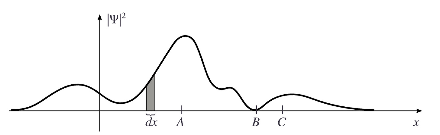 The wave function ψ(x,t) is not merely an abstract mathematical tool but is pivotal in predicting observable phenomena. For instance, the magnitude of ψ(x,t) at a particular point x directly influences the likelihood of a particle’s presence at that location when a measurement is performed. This concept is graphically represented by the probability density |ψ(x,t)|^2, where the area under the curve between any two points a and b gives the probability of finding the particle in that interval. Therefore, if ψ(x,t) is large at a point A, the probability of detecting the particle there is high, whereas it is low near a point B where ψ(x,t) is minimal.