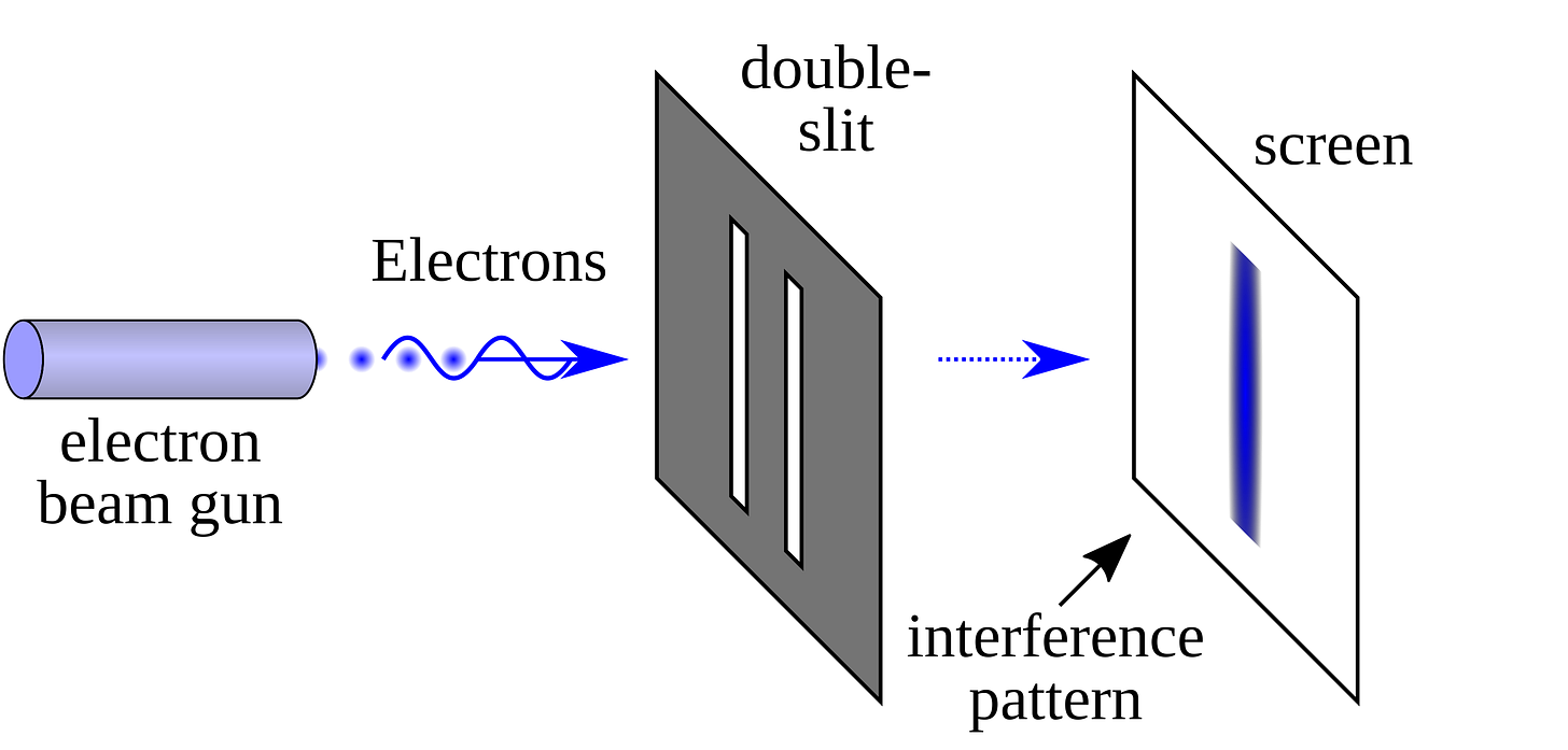 The dual nature of particles, as both wave-like and particle-like, is exemplified by the electron interference experiment. When electrons are sent through a double-slit apparatus, they exhibit interference patterns that are characteristic of waves, not particles. This interference pattern persists even when electrons pass through one at a time, suggesting each electron interferes with itself, traversing both slits simultaneously in a superposition of paths. The interference pattern emerges incrementally, akin to pointillism, where each electron contributes to the overall pattern, challenging classical expectations of continuous, smooth pattern formation.